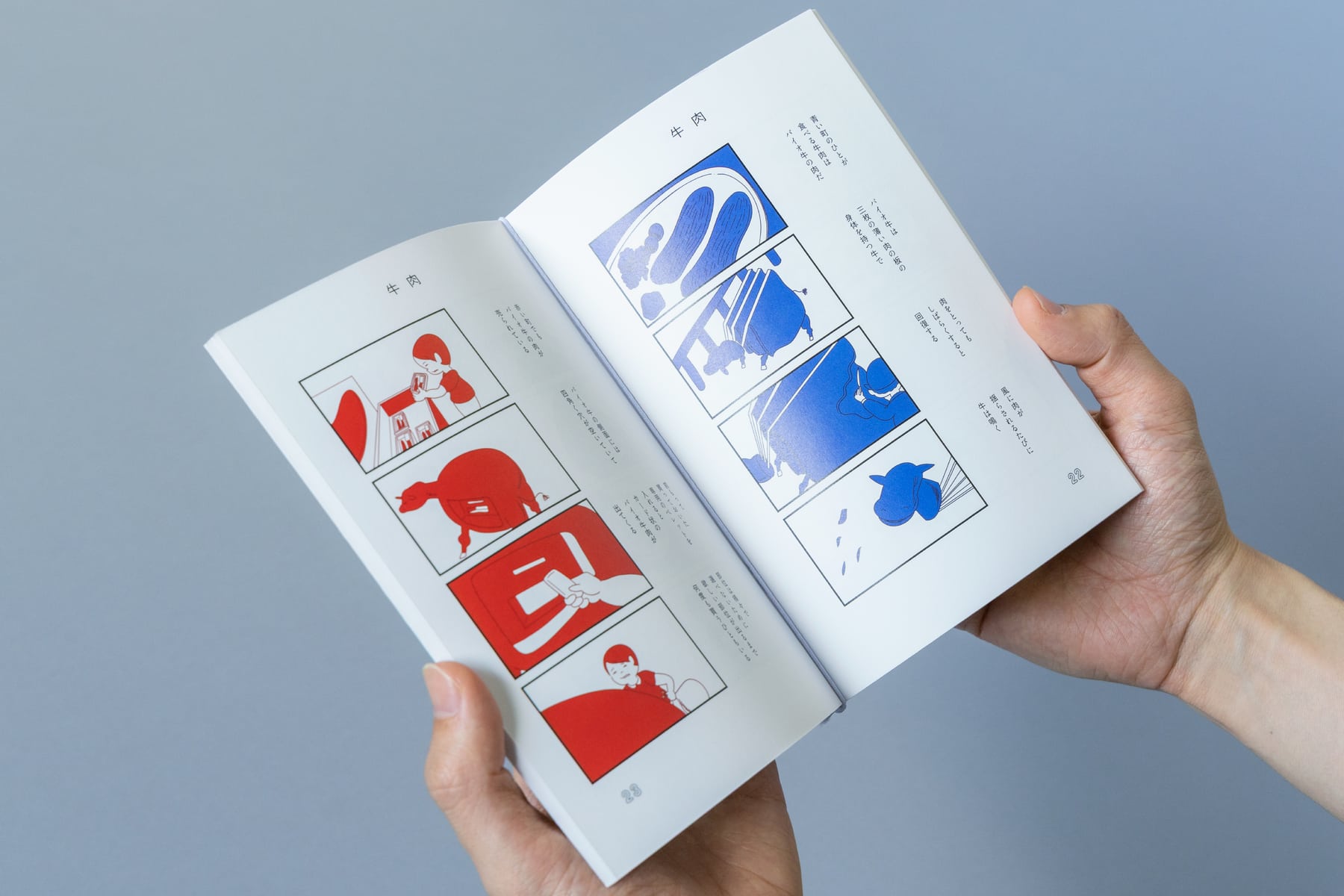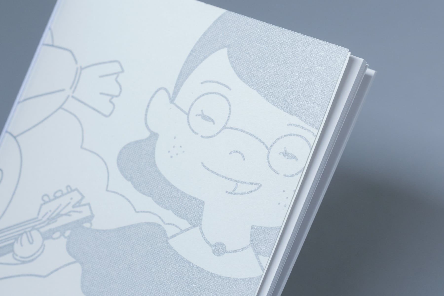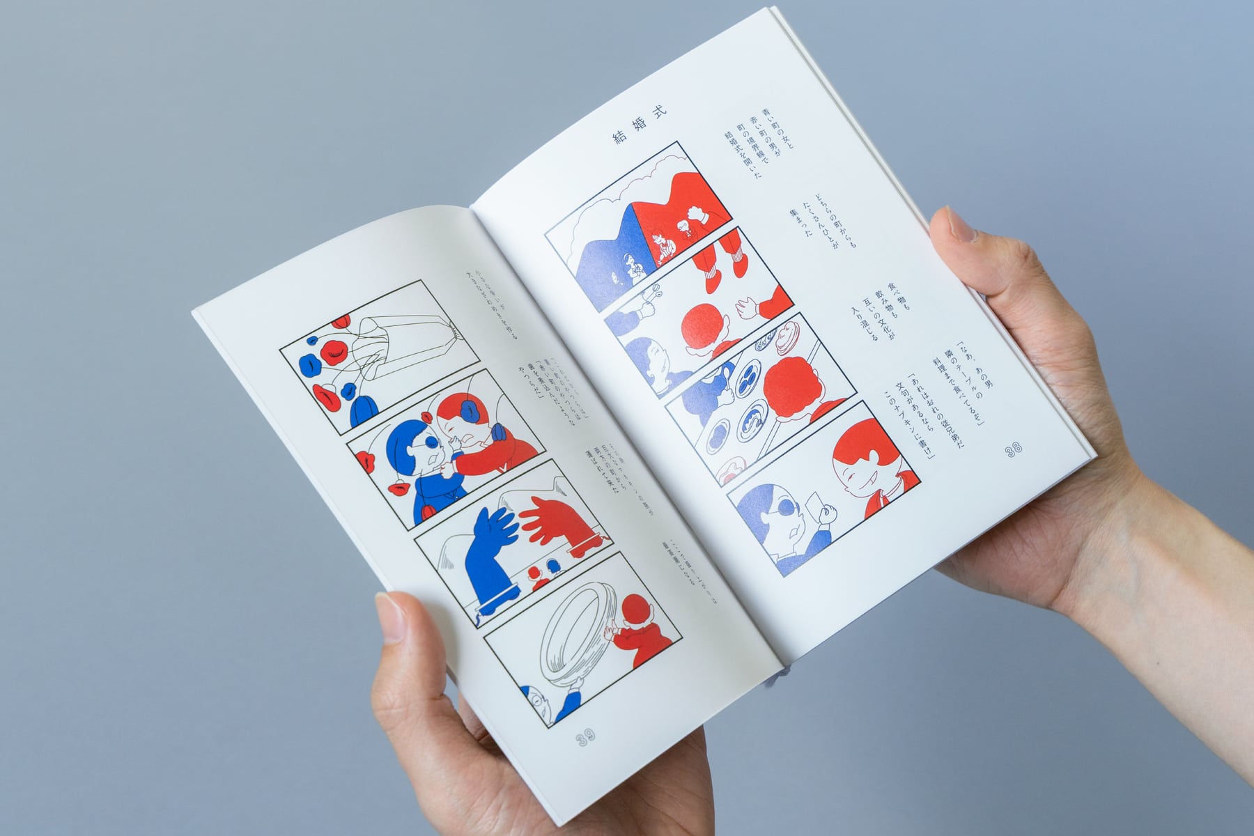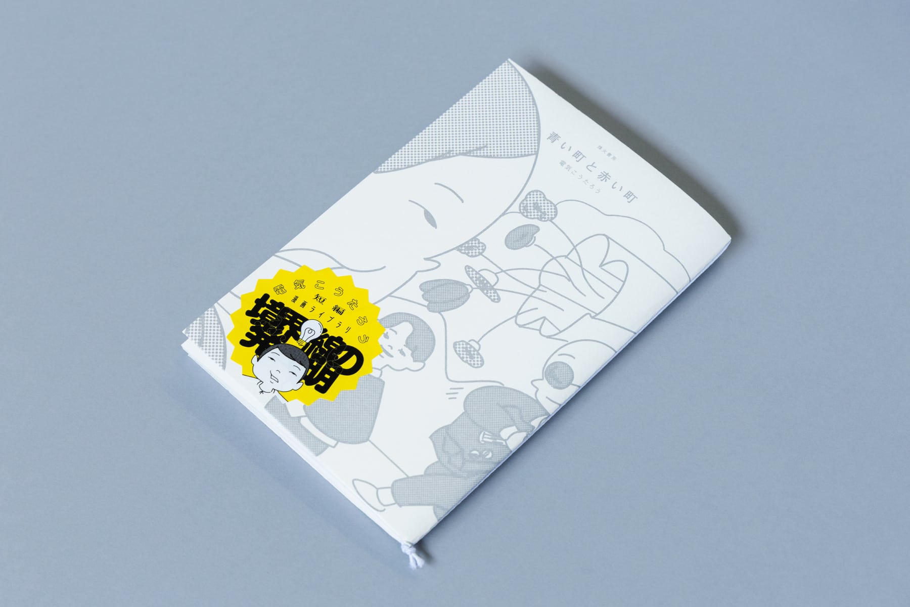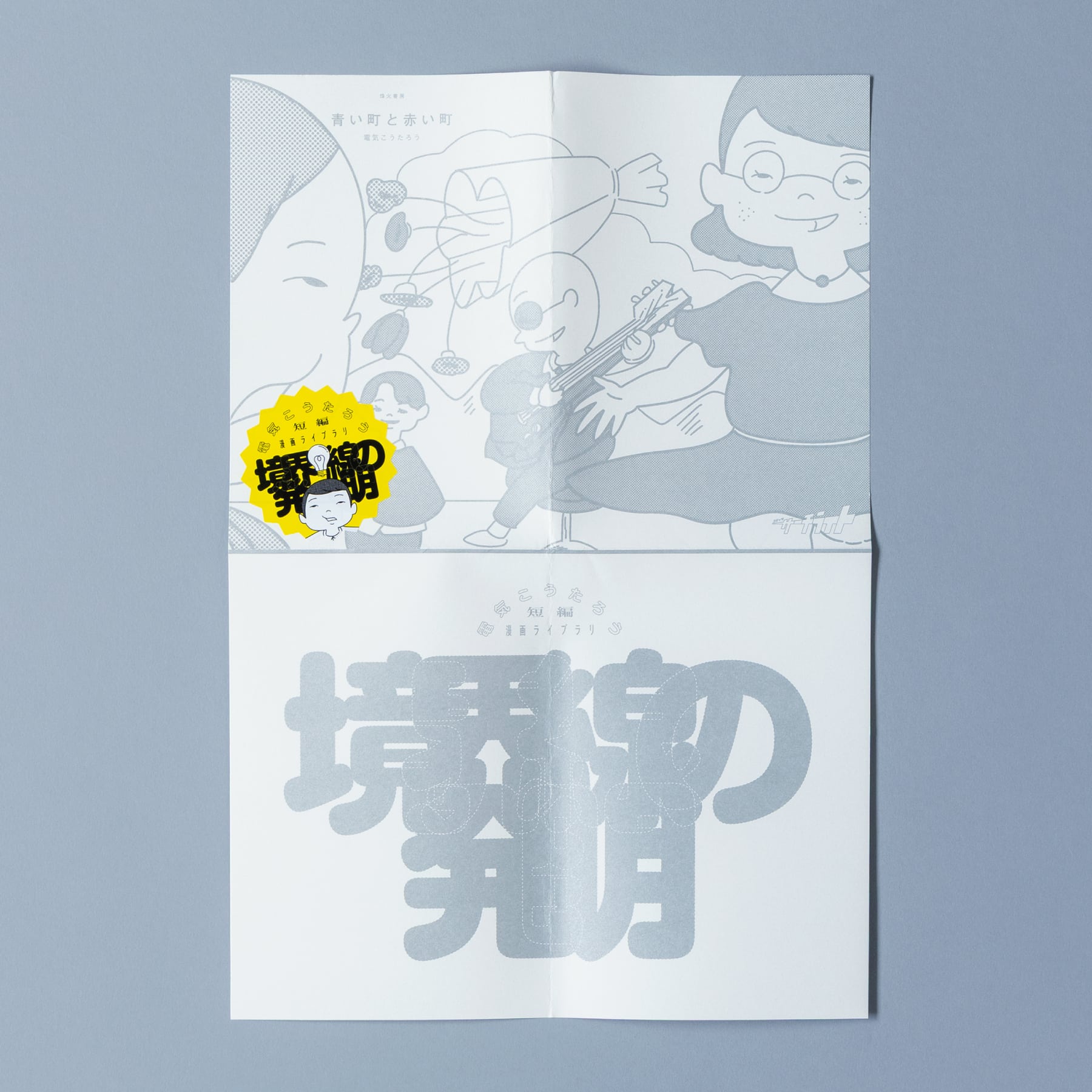 烽火書房の新たな漫画レーベル「コミック サーチライト」第一弾として、詩と物語から唯一無二の世界を紡ぐ漫画家・電気こうたろうさんの短編漫画集第1冊目のデザインを担当しました。 本シリーズのタイトルは「境界線の発明」。常識と非常識、喜びと哀しみ、当たり前と異質なもの──相反する要素が交差するその先に、私たちの目に映る「同じようでまったく違う」風景が描かれます。 第1冊目となる『青い町と赤い町』は、平凡な「赤い町」と、特異な変化を遂げる「青い町」を対比しながら進む四コマ漫画です。ふたつの町に暮らす人々や日常の出来事が登場し、それぞれの“ちがい”が、世界の美しさを照らし出します。 誌面デザインでは、右側に吹き出しが並ぶ独自のコマ割りと、見開きで2つの世界が隣り合う構成を活かし、タイトルもあえて反復。静謐で詩的な余韻に寄り添うように、詩集のような余白を生かした佇まいを目指しました。 フォントは、装飾性のあるものではなく、電気さんの世界観に共鳴するような軽やかで素直な書体を選択。絵に寄り添い、語りすぎずに世界観を引き立てる存在であることを大切にしています。 短編集のタイトル「境界線の発明」は、あくまでも作品群の背後にそっと添う存在として、発明の閃きの瞬間を模したシールで表現し、次作についてもシール貼りを共通ルールとすることでシリーズの“タグづけ”の役割を担います。文字は電気さんの絵のタッチに響く丸ゴシックを使用し、文字同士の重なりと衝突によって“境界”を表現しています。 また本作は、編集の嶋田さんからの「漫画らしくない佇まいにしたい」「紙の本としての存在感を持たせたい」という要望を受け、タイトルデザインは小さく詩集のように添え、仕様は、手作業でしか実現できないゴム紐綴じのカバーを採用。印刷は特色銀刷りで絵の祝祭感を強調し、さらに通常は本文用紙に使われる薄手の「モンテシオン」をカバーに用い、折ることで強度と機能を両立させました。 この“折る”という構造を活かし、カバーは同時に小さな絵が特徴的な電気さんの絵を逆に大きく扱うことで新たな絵の魅力の可能性を感じさせるポスターとしても楽しめる仕様となっています。