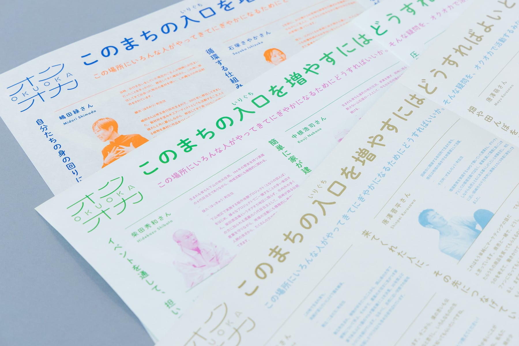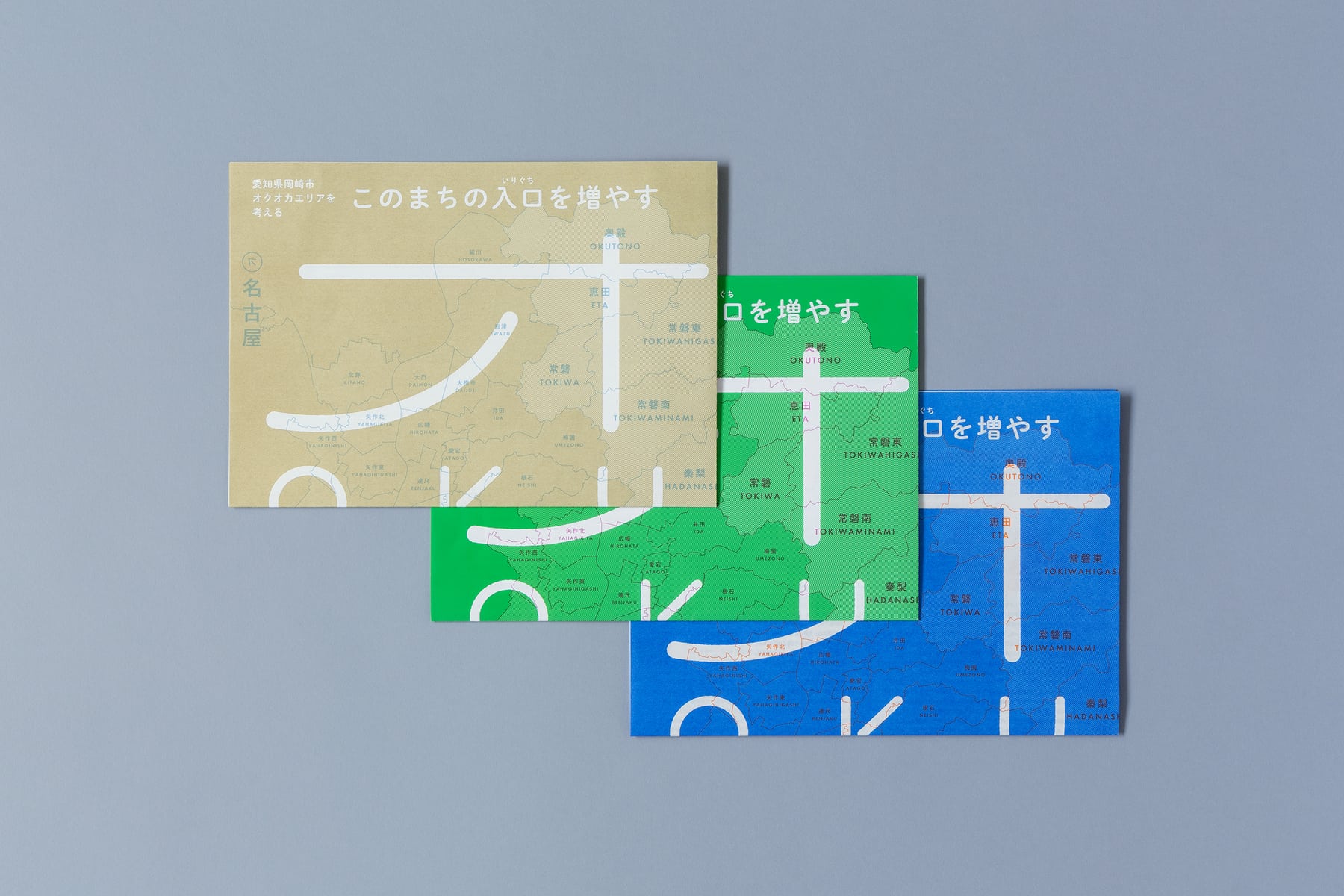 「いったーん」は、愛知県岡崎市の中山間地域、通称「オクオカ」地域への移住促進を目的としたプロジェクトです。いきなり移住することへの不安やリスクに対して、「まずは足を運んでみよう」「まちに行ってみよう」という気持ちを促し、体験を通して移住を考えるきっかけをつくる取り組みです。 「このまちの入口をふやす」を合言葉に、人や自然、食、おもしろスポットなど、オクオカにまつわるさまざまな魅力を、ウェブやツールを通じて発信しています。 ロゴデザインでは、移住者を「風」に見立て、オクオカにふわりと吹き込む風のような存在として、軽やかな線で表現しました。ロゴはひとつの形に固定せず、媒体に展開されるたび自由に形を変えます。それは本プロジェクトの趣旨を体現するものであり、「いったん行ってみる」というハードルの低さや、さまざまな移住のかたちを表す多様な「ターン」を表現したものでもあります。 広報ツールでは、かろやかでとっつきやすい表情をもたせながら、表面に大きく地域名とマップを打ち出し、裏面には実際にオクオカで暮らす移住者や地元の方々のリアルな声をインタビュー記事として掲載。市内各所で掲示・配布され、地域との接点を広げるメディアとして活用されています。 媒体の更新性と毎号手に取る際の新鮮さを考慮して、カラーと用紙は異なるバリエーションとして展開し、読み手に飽きさせない仕様を目指しています。